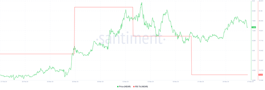 Under stigningen fra den 29. februar til den 13. marts, hvor NEAR’s pris steg markant, forblev dens Relative Strength Index (RSI) over 80. Efter denne periode fulgte en korrektion, hvor NEAR’s pris faldt fra $8,84 til $6,6 på bare fire dage.