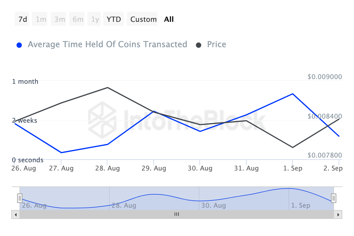 Trods det nylige bearish miljø har Notcoin-indehavere vist betydelig tålmodighed. Ifølge data fra IntoTheBlock er den gennemsnitlige beholdningstid for transaktionerede coins steget med 247% over de sidste syv dage.
