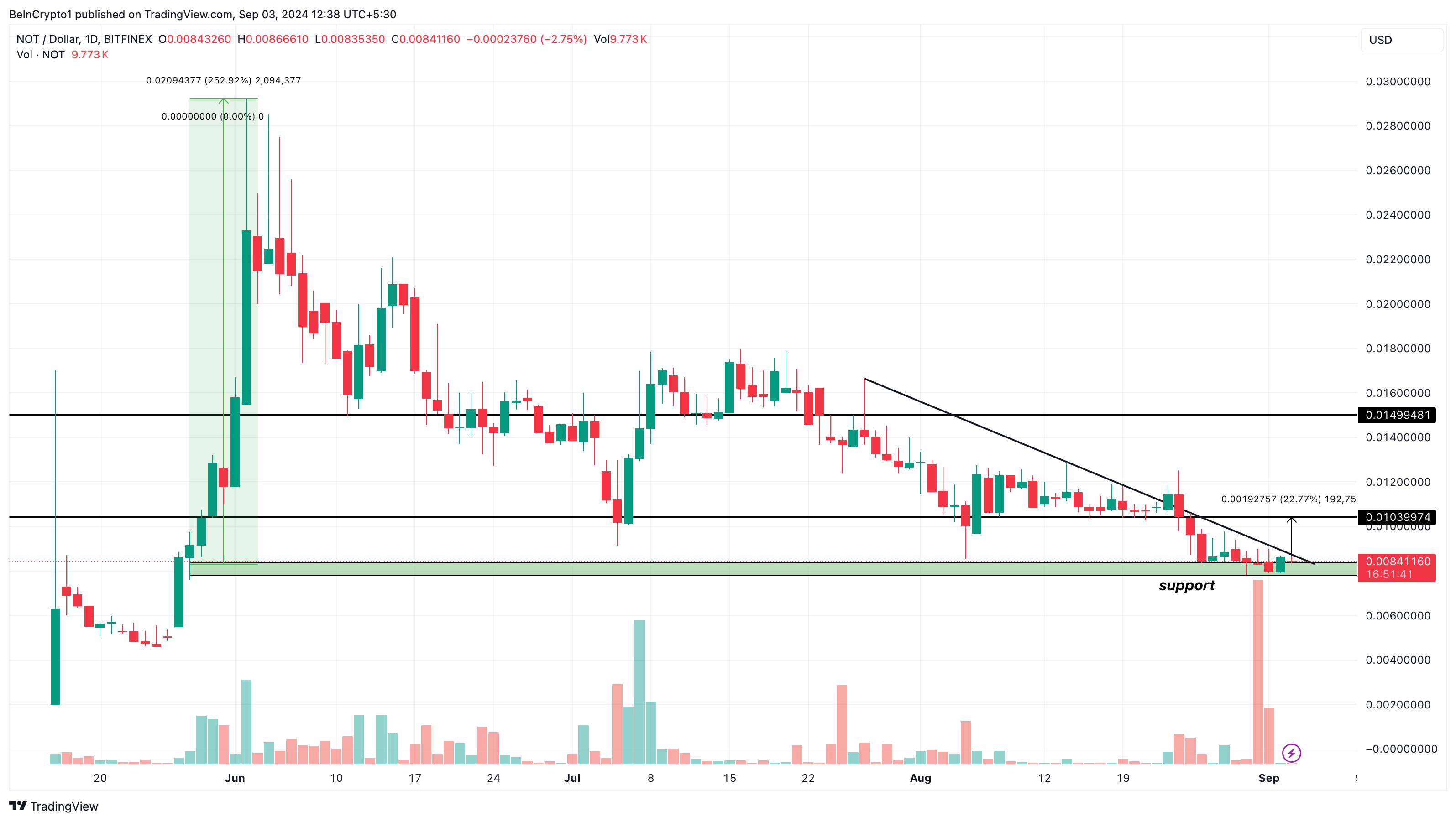 Seneste forsøg på at genprøve $0.014 er mislykkedes, hvilket antyder, at det kan være et udfordrende mål. Hvis bulls kan forsvare støtten på $0.0084, kan Notcoins første mål være omkring $0.0095, potentielt stigende til $0.010.