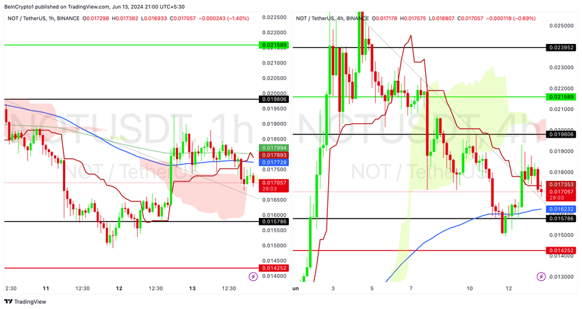 Diagrammet for Notcoin (NOT) på både 1-timers og 4-timers tidsrammer fremhæver flere kritiske støtte- og modstandsniveauer, angivet med vandrette linjer. Disse niveauer svarer til vigtige flade basisstrukturer i 4H Ichimoku Cloud og andre vigtige prispunkter.