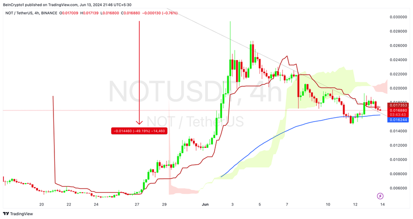 Efter kortvarigt at have brudt over 100 EMA den 11. juni kom prisen ikke ind i Ichimoku Cloud og testede Ichimoku baseline igen. Efter dagens Bitcoin-fald faldt NOTs pris under basislinjen (i rødt), hvilket nu tjener som modstand, hvilket indikerer en fortsættelse af den bearish trend.