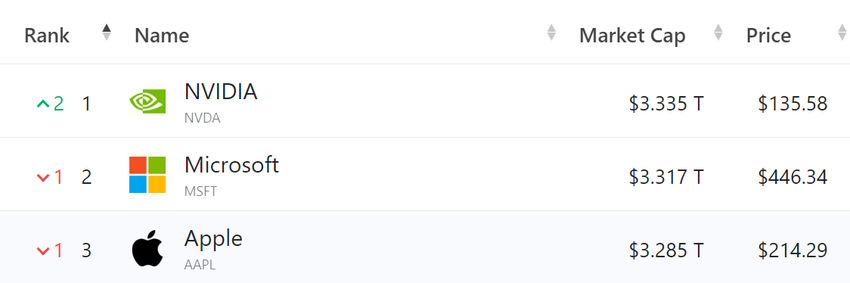 Ifølge de seneste data er Nvidias aktiekurs (NVDA) nu $135.58 med en markedsværdi på $3.33 billioner. I mellemtiden har Microsoft og Apple markedsværdier på henholdsvis $3.31 billioner og $3.28 billioner.