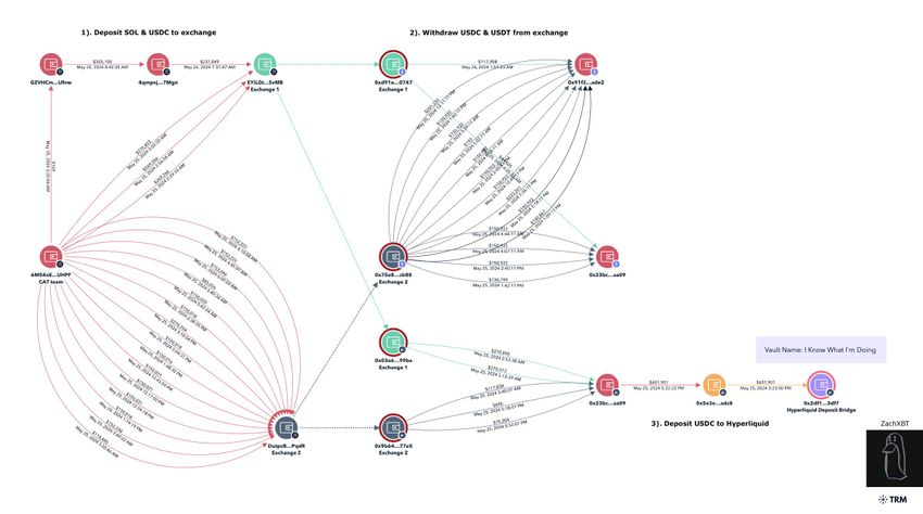 Ved hjælp af tidsanalyse forbandt ZachXBT udbetalinger fra børser på Ethereum og Arbitrum med Solana-indskuddene i lignende beløb. Den 25. maj kl. 17:22 UTC overførte wallet-adressen 0x23bcf31a74cbd9d0578bb59b481ab25e978caa09 650.000 USDC til 0x5e3edeb4e88aafcd1f9be179aa6ba2c87cbbadc8 og deponerede det til Hyperliquid for at handle med perpetuals. Desuden åbnede wallet-adressen 0x5e3 den 26. maj fra 17:45 til 17:56 UTC en lang position for ORDI til en værdi af 2,3 millioner dollars.