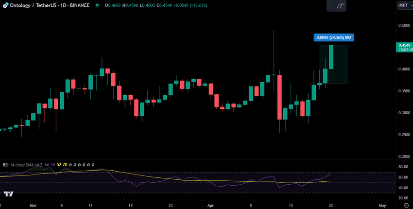 Mens nyheden er et positivt skridt fremad for projektet, har Ontology (ONT) oplevet en stor prisstigning på 26%, i løbet af de sidste 24 timer. Prisdiagrammet illustrerer en bullish tendens med en opadgående bane, i løbet af de seneste handelssessioner.