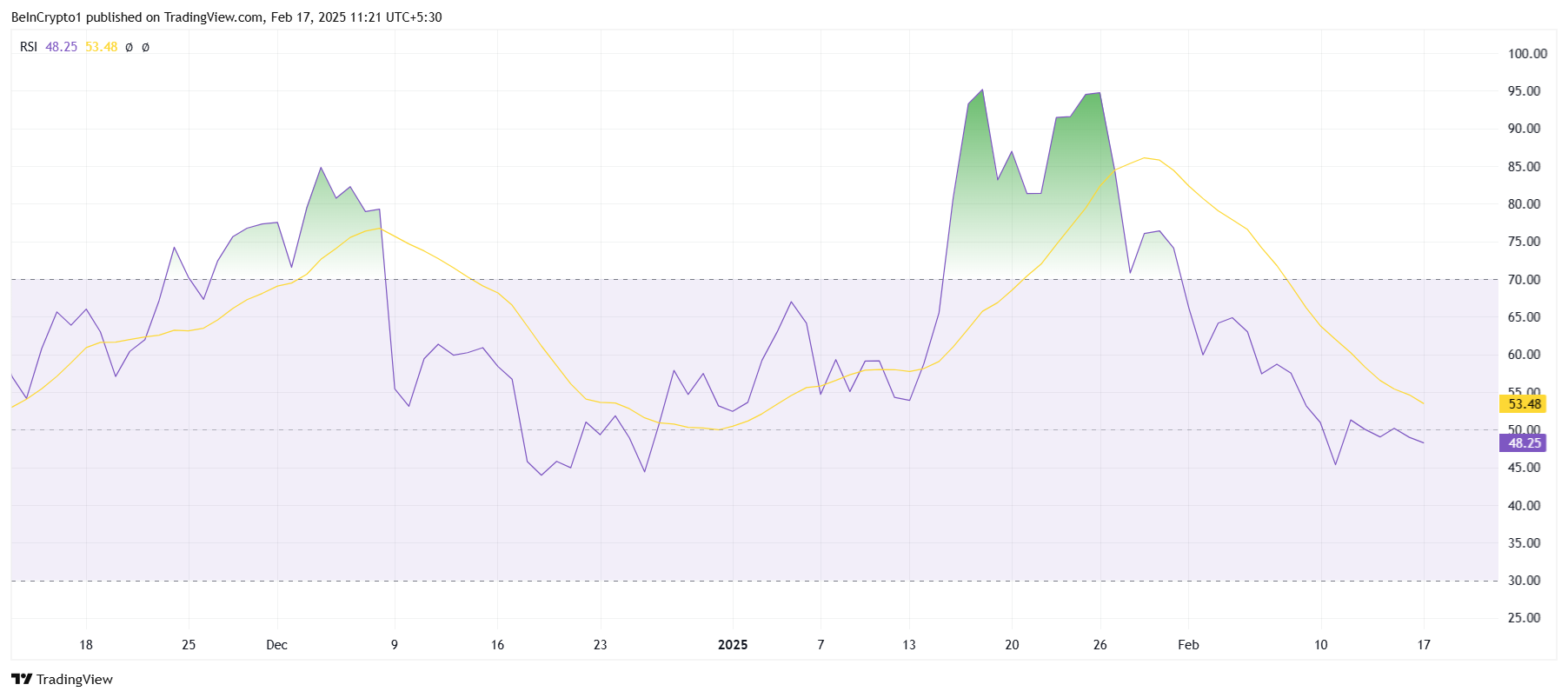 Onyxcoins bredere makro momentum hælder også mod bearish, som indikeret af tekniske indikatorer som Relative Strength Index (RSI). RSI’en har været fastlåst under den neutrale 50,0 linje de sidste fem dage, hvilket signalerer, at bearish momentum fortsat dominerer. Denne mangel på momentum over den neutrale linje antyder, at altcoinen står over for yderligere nedadgående pres.