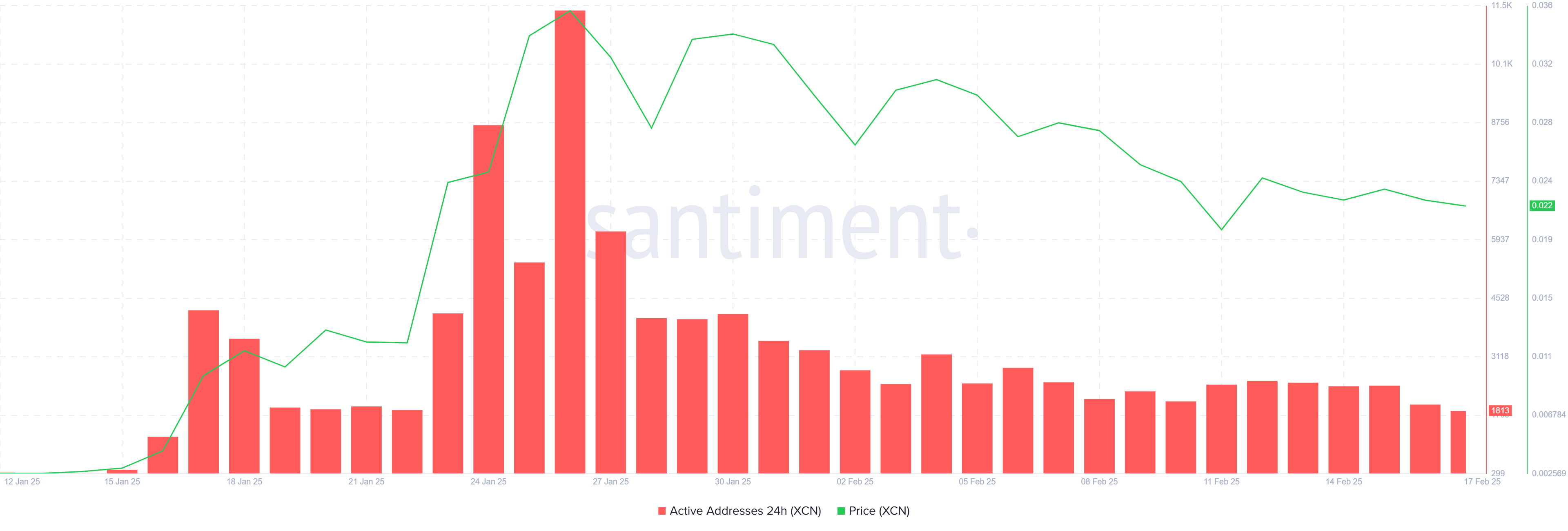 XCN’s marked stemning er i øjeblikket svag, da aktive adresser er faldet til et månedligt lavpunkt. Dette indikerer, at en stor del af XCN-indehaverne er tilbageholdende med at deltage i netværket, sandsynligvis på grund af de vedvarende tab. Fraværet af stærkt opadgående momentum tvinger mange investorer til at indtage en afventende holdning.