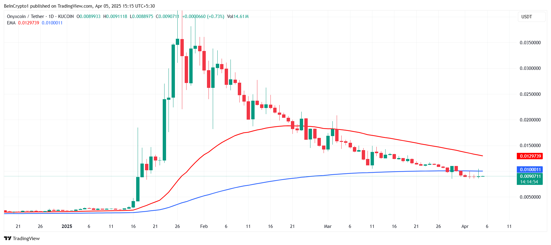 Onyxcoins tekniske indikatorer signalerer også yderligere udfordringer. De eksponentielle glidende gennemsnit (EMAs) nærmer sig en Death Cross, en bearish begivenhed, der opstår, når 200-dages EMA krydser under 50-dages EMA. Hvis nedtrenden fortsætter, øges sandsynligheden for denne krydsning, hvilket ville indikere, at salgspresset dominerer.