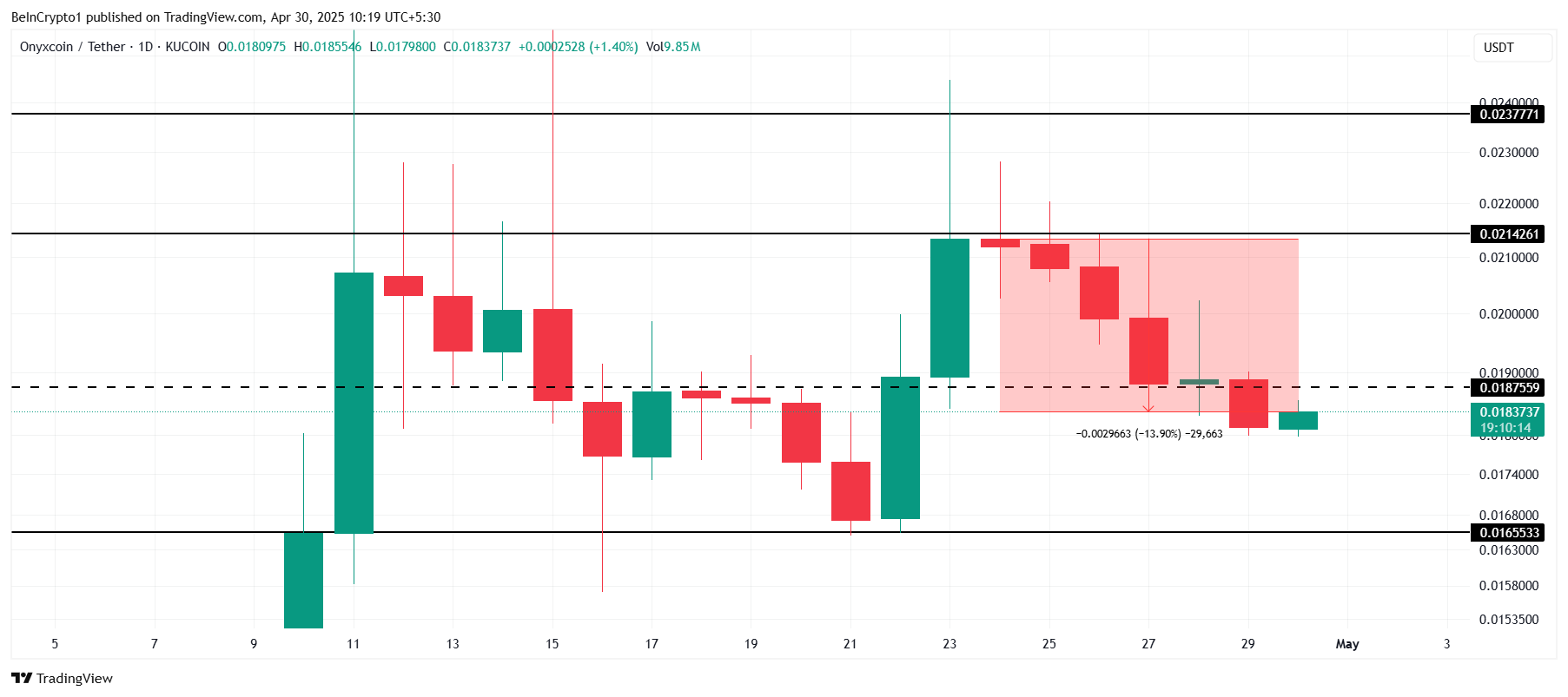 Den næste store støtte for Onyxcoin er ved $0,0165. Hvis kursen fortsætter med at falde, vil dette støtteniveau sandsynligvis blive testet. Et brud under $0,0165 kan udløse yderligere lange afviklinger, hvilket potentielt kan få Onyxcoin til at falde endnu lavere. De nuværende markedsforhold tyder på, at yderligere tab kan være nært forestående, hvis altcoinen ikke formår at stabilisere sig over dette vigtige niveau.