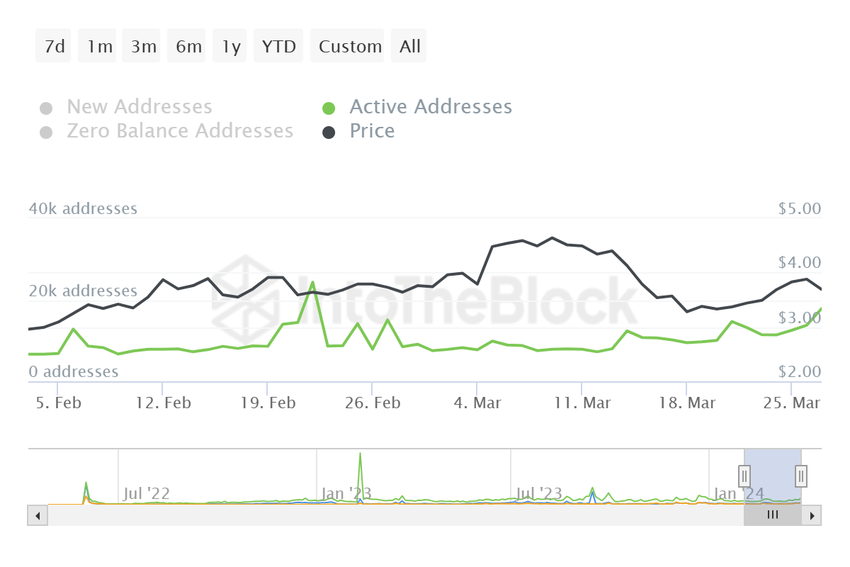 Selvom begyndelsen af måneden var dyster for Optimism-prisen, fandt altcoinen fodfæste i løbet af de sidste par dage. Dette var resultatet af en stigning i deltagelsen fra OP-indehavere. Det fremgår tydeligt af stigningen i aktive adresser, som er vokset med over 30% i løbet af de sidste 24 timer.