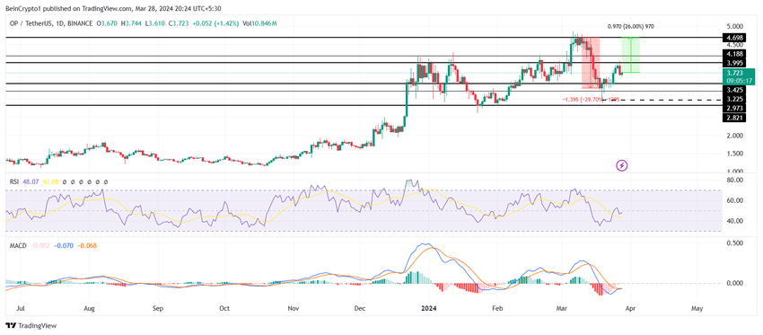 Optimismens pris handles i øjeblikket til $3,72 efter ikke at have brudt modstanden, der er markeret til $3,99. Hvis denne barriere krydses, vil OP kunne genvinde $4,00 som et støttegulv, hvilket vil muliggøre en stigning mod $4,69, hvilket markerer et nyt år-til-dato-højdepunkt samt et 26% rally.