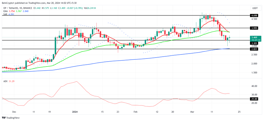 Hvis Optimism-prisen kan opretholde 3,30 dollars som et støttegulv, vil det bearish momentum skifte til en uptrend. Det gennemsnitlige retningsindeks (ADX) er stadig over 25,0-tærsklen. ADX er en teknisk analyseindikator, der bruges til at måle styrken af en trend. Den spænder fra 0 til 100, hvor højere værdier indikerer en stærkere tendens, uanset om den er bullish eller bearish.