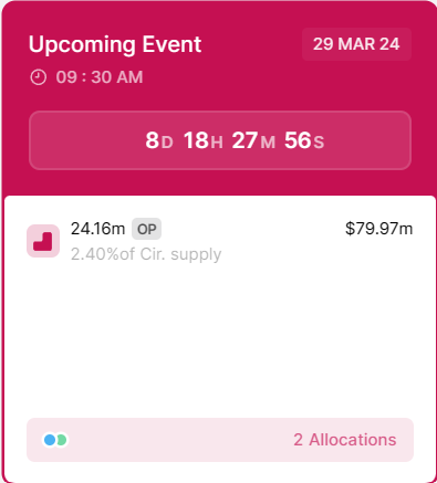 En større token-oplåsning er dog sat til at finde sted den 29. marts. Omkring 24 millioner OP til en værdi af næsten 80 millioner dollars vil blive låst op, og når næsten 2,4% af den cirkulerende forsyning kommer ind på markedet, kan Optimisms pris blive negativt påvirket.