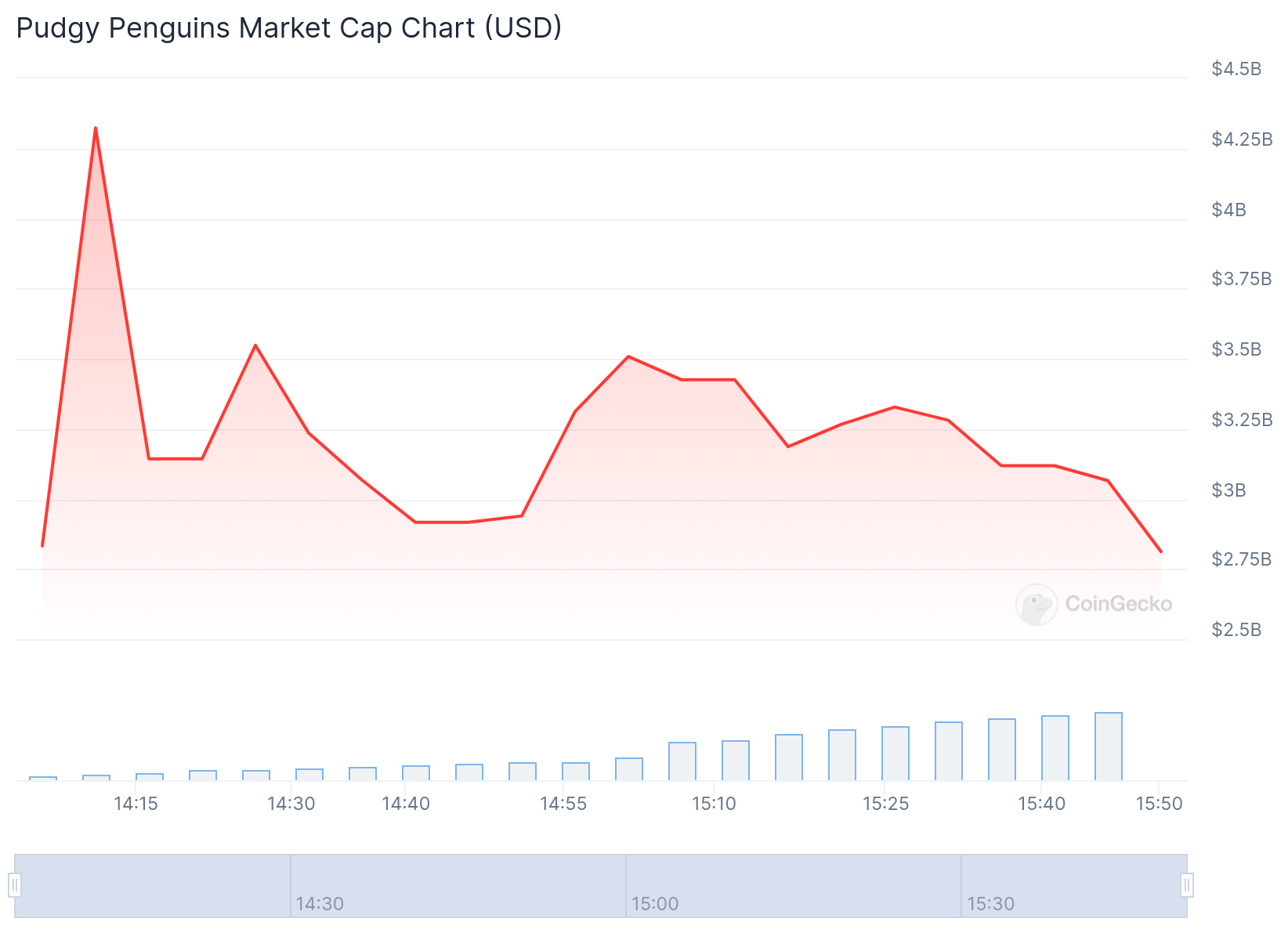 Men i modsætning til nylige Binance-noteringer, som har drevet flere tokenkurser op, er PENGUs markedsværdi faldet fra 4,32 milliarder dollars til 3,07 milliarder dollars i øjeblikket.