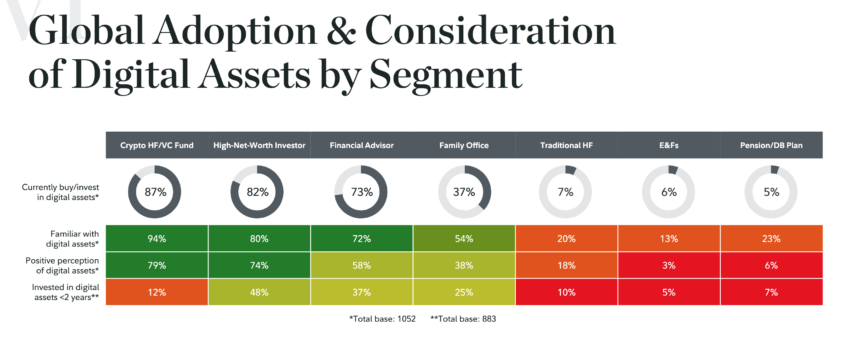 En nylig undersøgelse foretaget af Fidelity Digital Assets, viser en splittelse i markedets holdning til at integrere kryptobaserede produkter i traditionelle porteføljer. Omkring 80% af de velhavende privatpersoner er optimistiske over for kryptovaluta, sammenlignet med kun 23% af pensionsselskaberne.