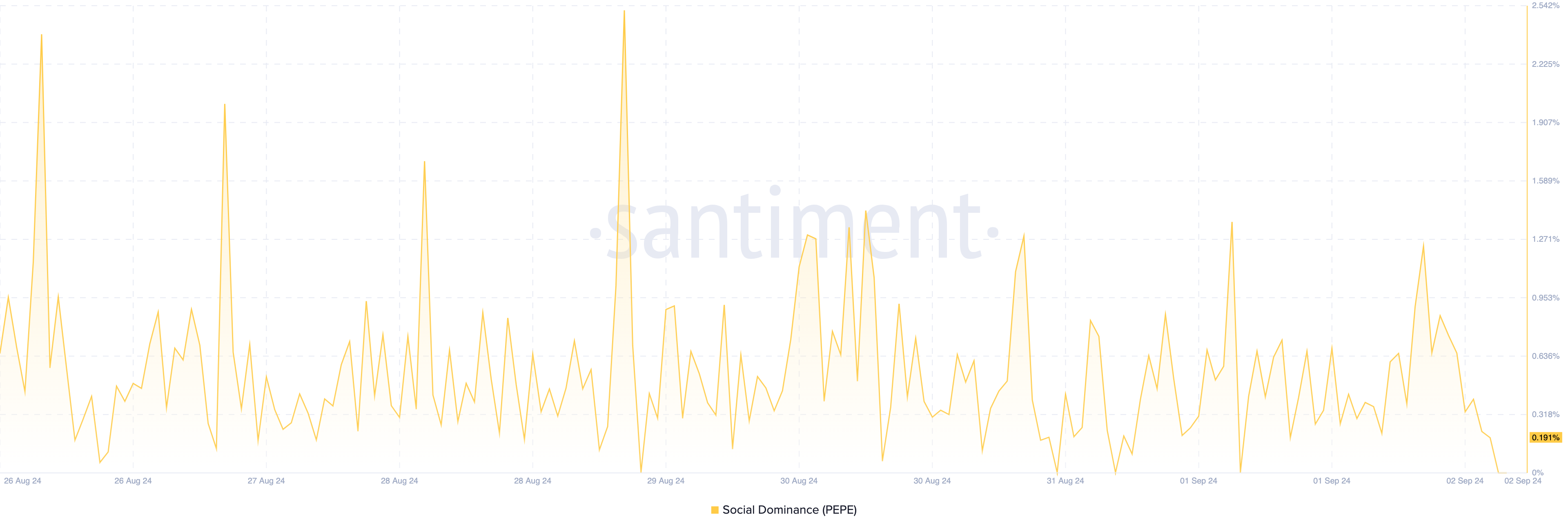 Desuden indikerer data fra samme analytiske platform, at PEPE måske har nået sit bundniveau. Denne konklusion er baseret på målingen af social dominans, som sporer, hvor meget en kryptovaluta bliver diskuteret.