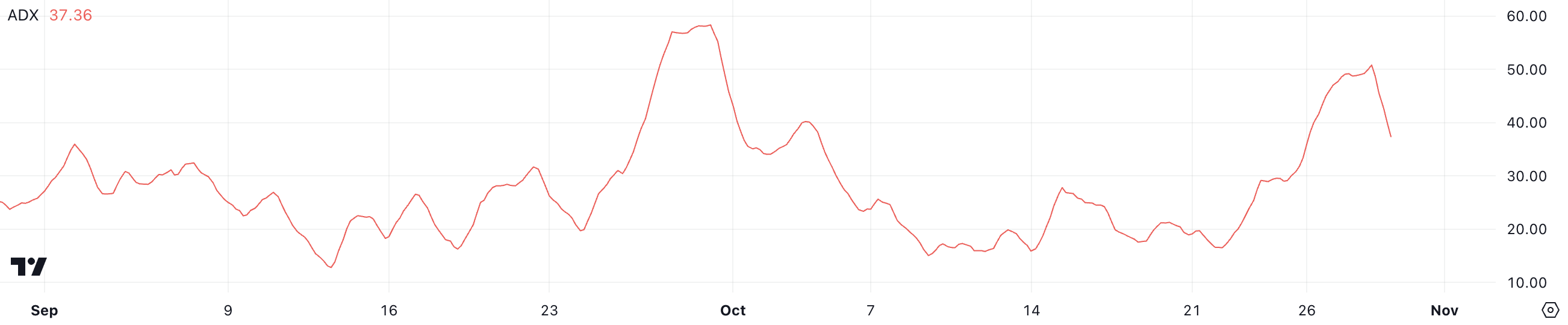 En ADX over 50 viser højt momentum, mens en værdi på 37 betyder, at markedet kan være ved at køle ned.