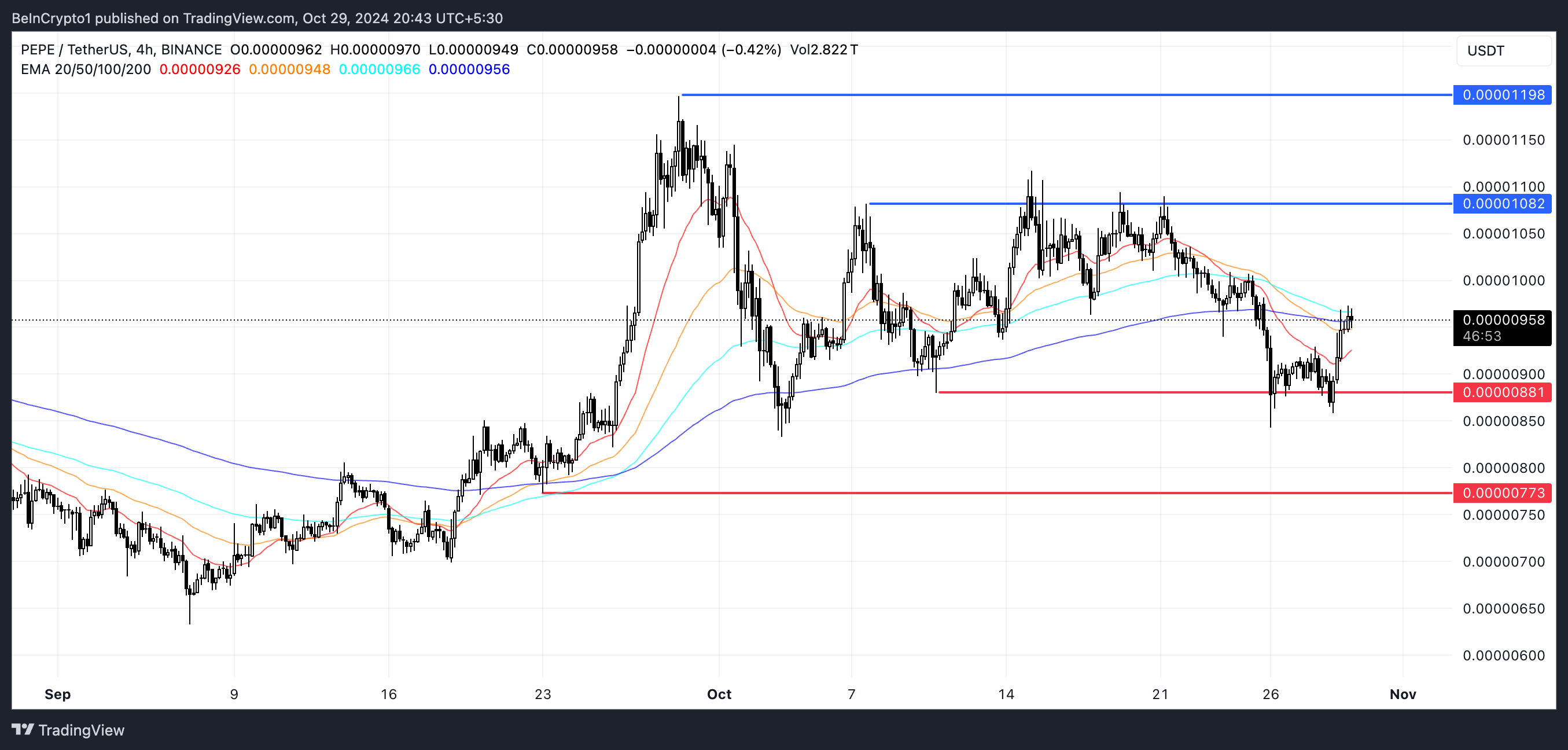Men hvis den opadgående trend mislykkes, og PEPE går ind i en nedadgående trend, kan prisen falde til støtteniveauer ved $0.00000881 eller endda $0.00000773. Dette betyder, at selvom der er en mulighed for vækst, er der også en risiko for tilbagegang, hvis momentum ikke opretholdes.