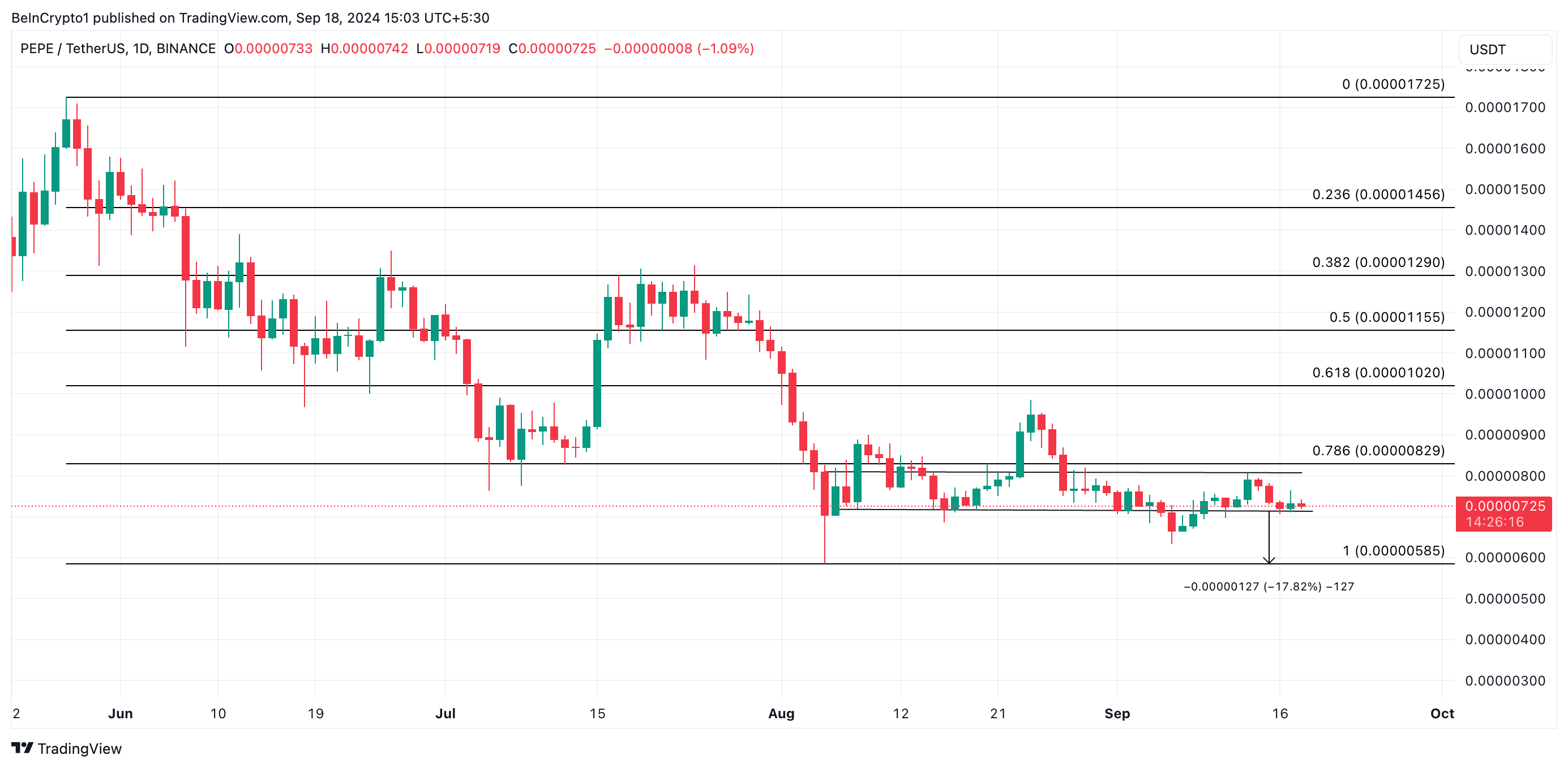 BeInCryptos analyse af PEPEs kurs på dagschartet viser, at meme-coinen har handlet inden for en horisontal kanal siden den 5. august. Kursen har konsekvent mødt modstand ved $0.000008 og fundet støtte ved $0.000007. Denne periode med sidelæns handel afspejler et fald i markedsvolatiliteten.