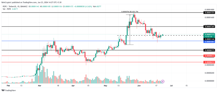 PEPES pris på $0,00001173 ligger kun lidt over støttelinjen på $0,00001146. Indtil sidste uge svævede meme-coinen under samme linje og gled næsten under $0.00001007.