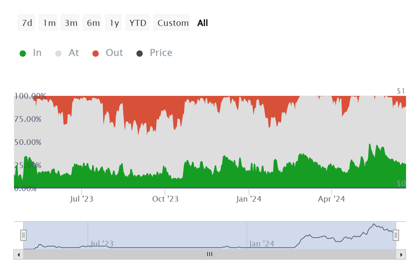 Derudover står PEPE over for truslen om profittagning fra investorer. Når vi observerer de aktive adresser efter rentabilitet, bemærker vi, at ca. 26% af de deltagende investorer har overskud.