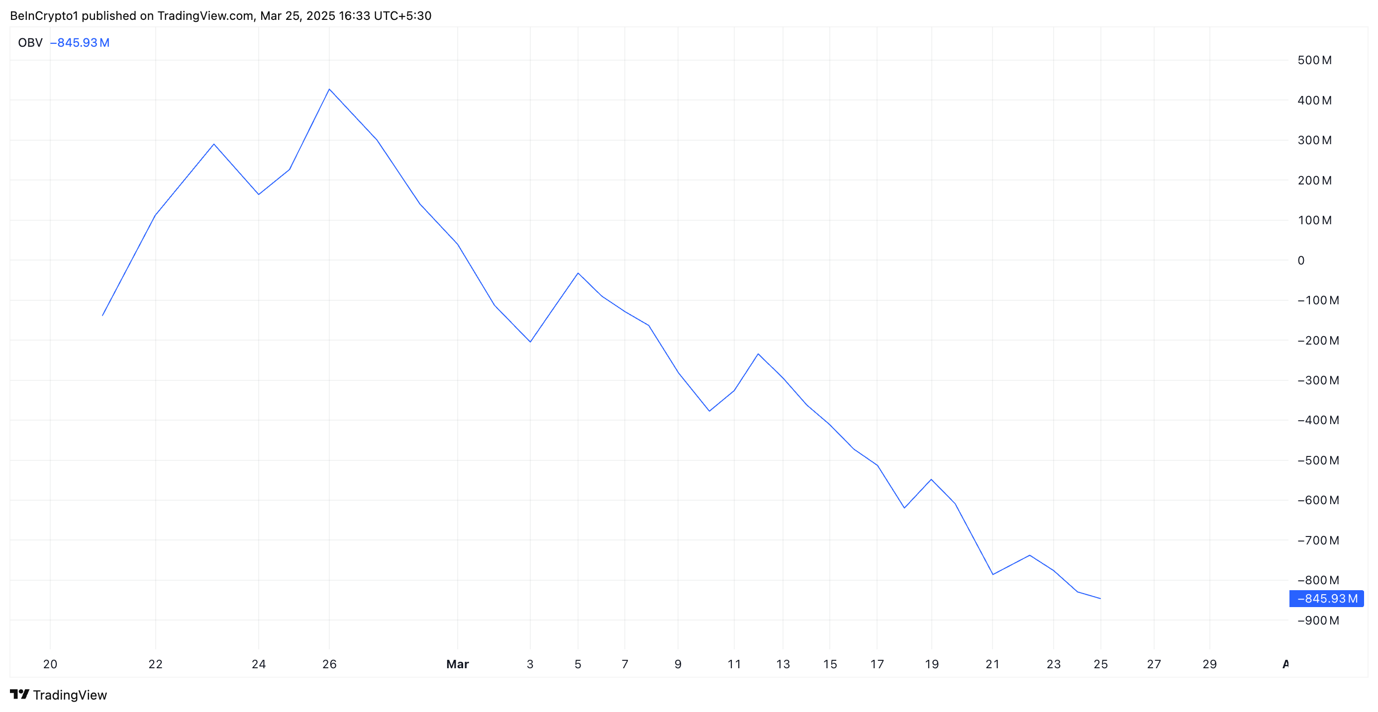 I øjeblikket ligger PI’s OBV på et rekordlavt niveau på -845,93 millioner, hvilket er et fald på over 2000% siden begyndelsen af marts.
