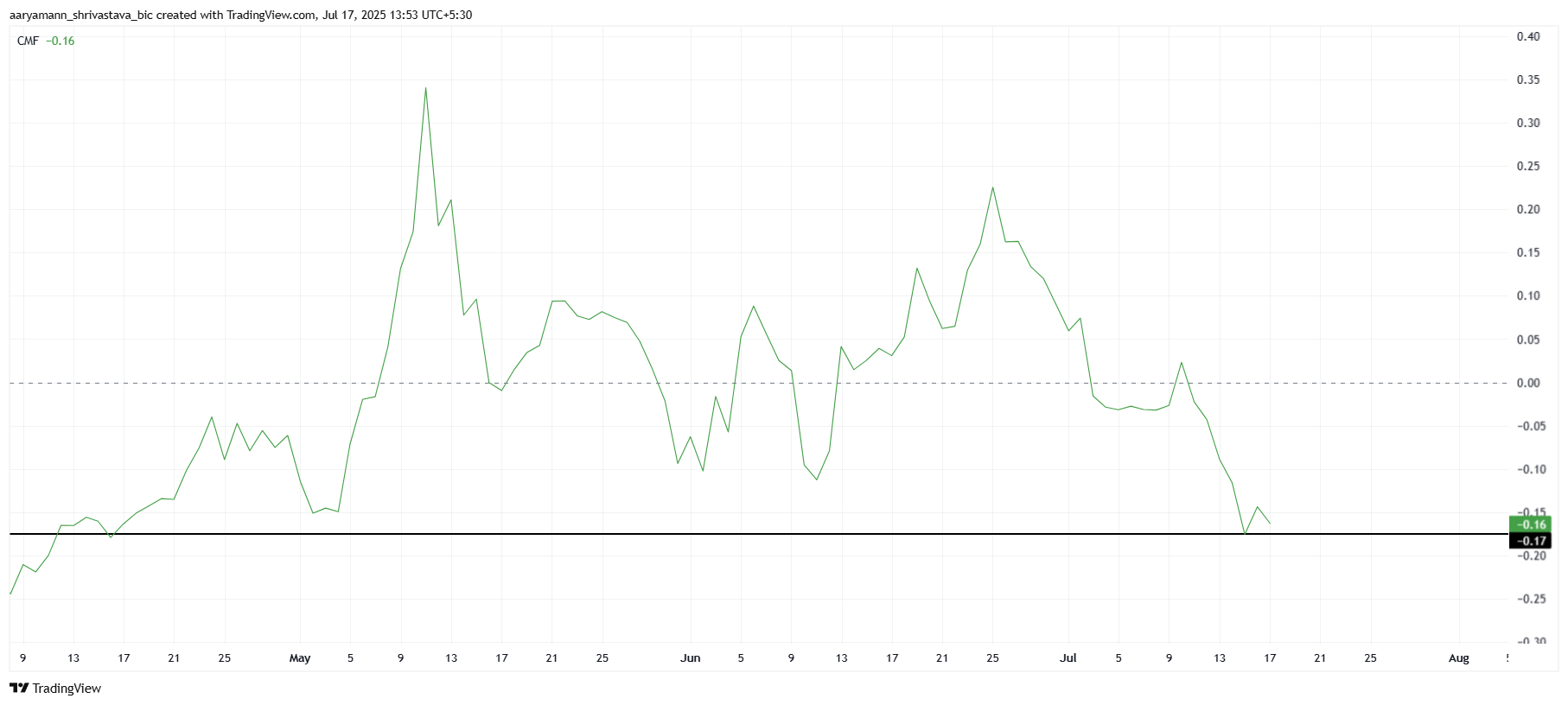 Det overordnede makro momentum for Pi Coin står også over for modvind. Chaikin Money Flow (CMF), som sporer pengestrømmen ind og ud af et aktiv, er faldet til et 3-måneders lavpunkt. Dette indikerer, at Pi Coin oplever en markant kapitaludstrømning, med flere penge, der forlader coinen end kommer ind.