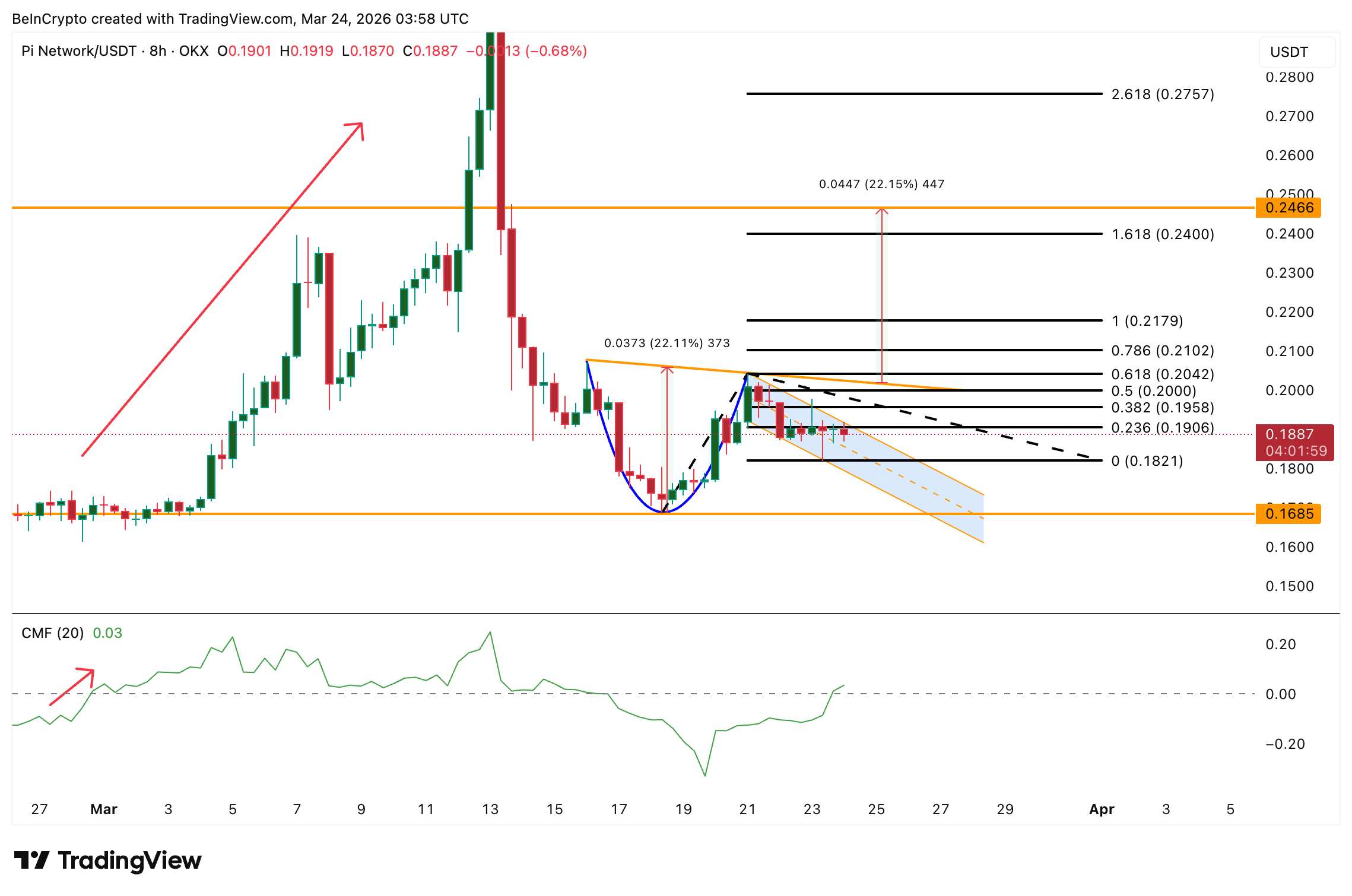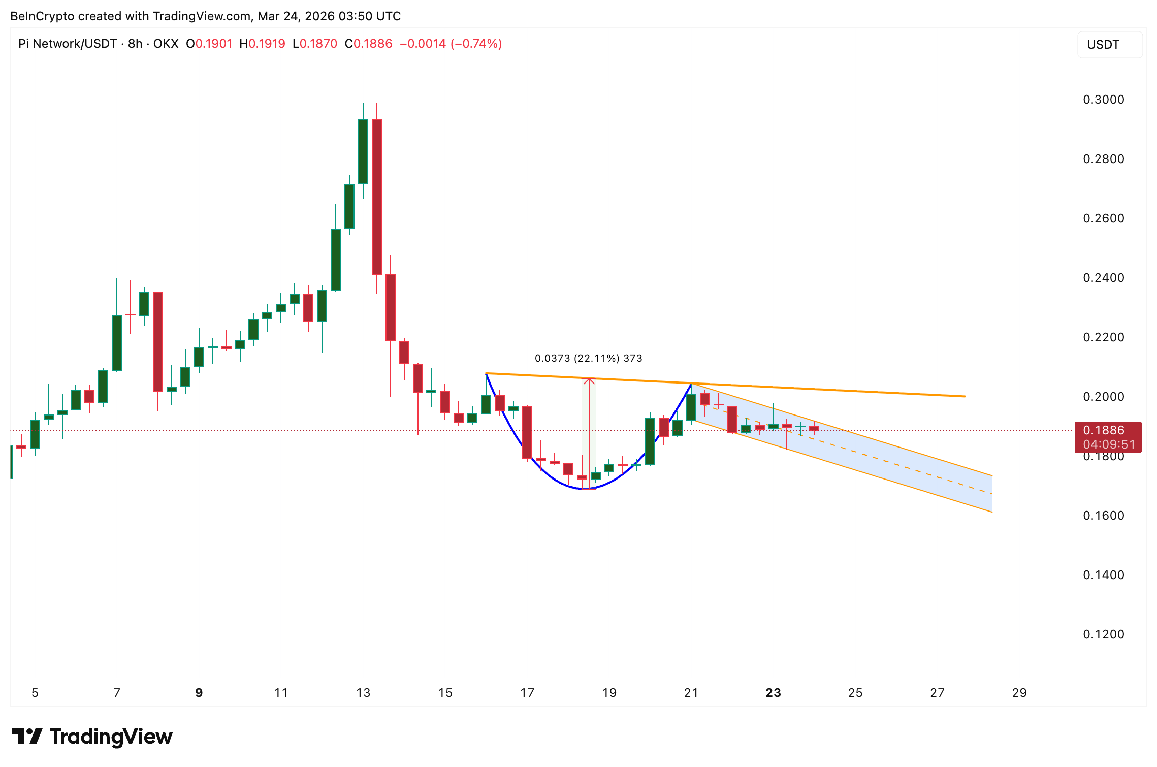 I øjeblikket kræver Pi Coin en 8-timers lukning over $0,200 for at vende cup-and-handle-mønstret fra en udviklende formation til en bekræftet kortsigtet stigning.