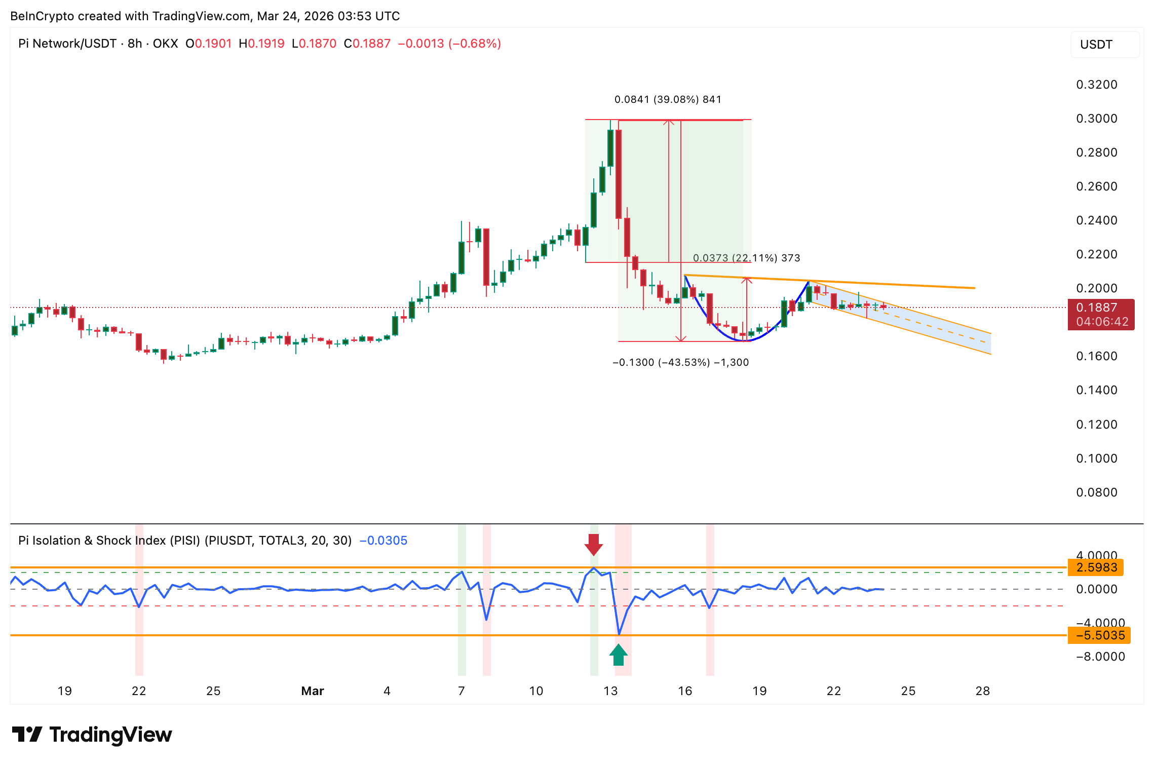 PISI har dokumenteret effekt på tokenet. Den 12. marts, da indekset steg fra 1,02 til et højdepunkt på 2,59 i den grønne zone, steg Pi med omkring 40%. Omvendt, den 13. marts, da PISI faldt til -5,50 i den ekstreme zone, korrigerede Pi cirka 43%. At PISI nu er flad, indikerer, at konsolideringen i hanken kan fortsætte, før der kommer en afgørende bevægelse.