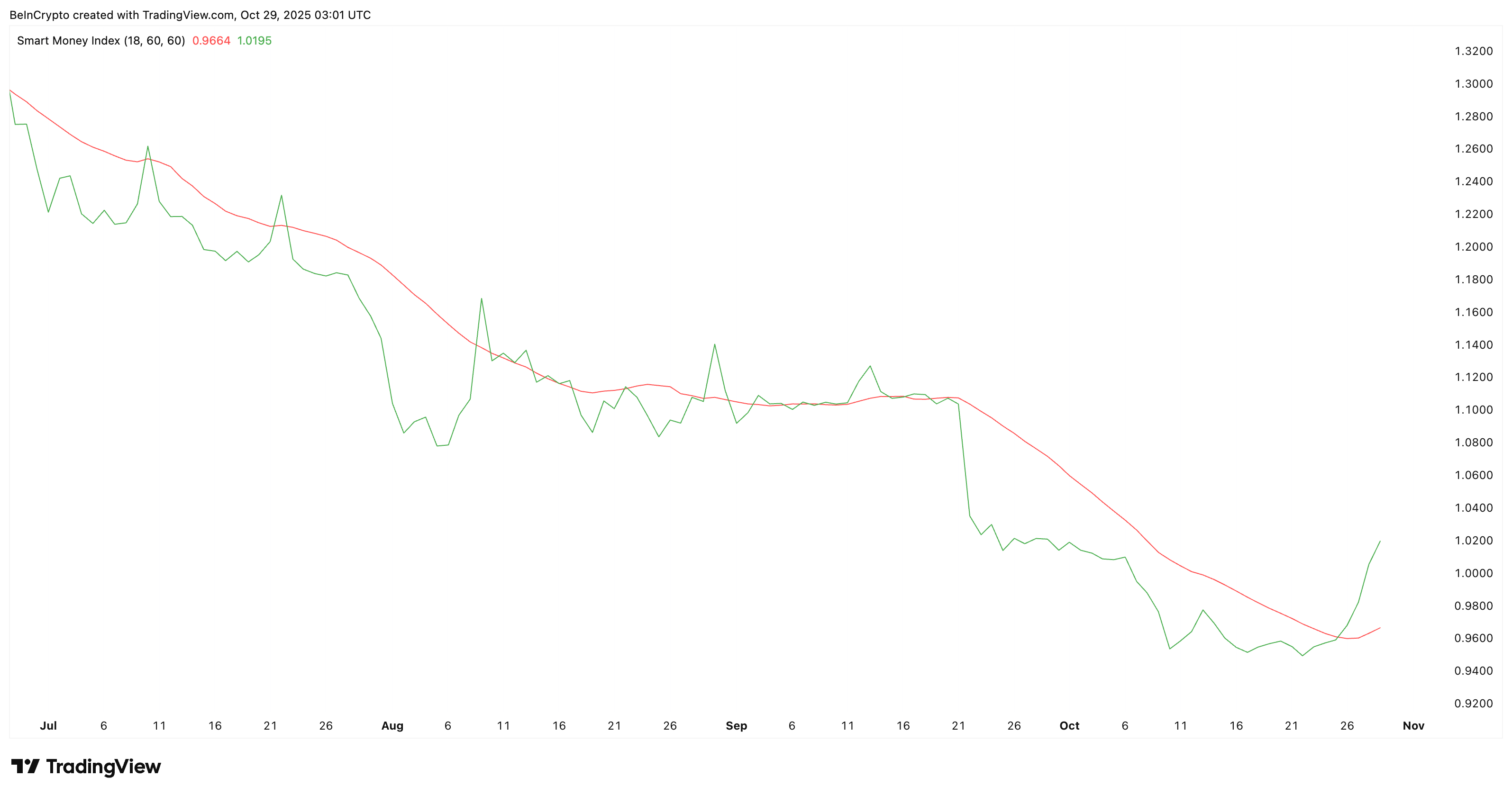 Smart Money Index (SMI), som sporer aktivitet fra historisk profitable eller institutionelle wallets, er steget kraftigt siden 25. oktober. Indekset bevægede sig for nylig over sin signallinje for første gang i uger, et tegn på, at større investorer vender tilbage efter at have siddet ude af meget af den seneste nedadgående trend.
