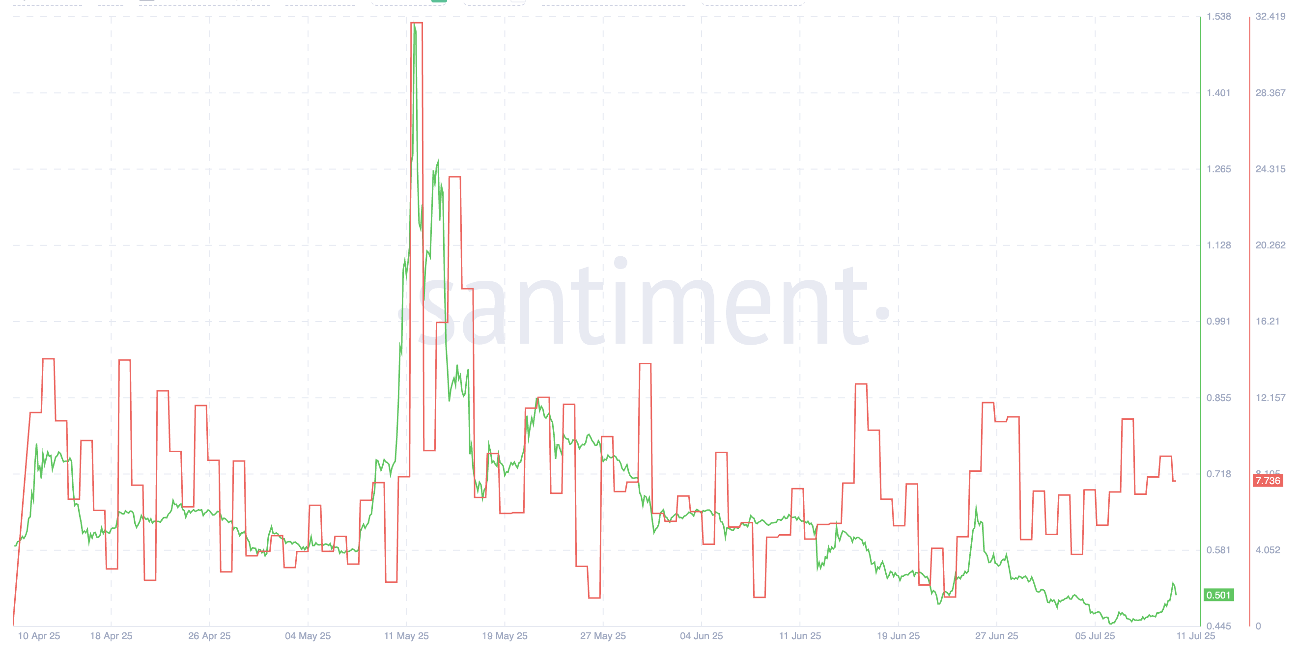 Det, der skiller sig ud denne gang, er afbrydelsen: kursen har ikke fulgt med samme intensitet. Selvom PI kortvarigt sprang fra $0,465 til $0,51 den 10. juli, svæver den stadig nær en vigtig modstand. Hvis stemningen forbliver stabil, som den har gjort i tidligere stigninger, kan en forsinket kursreaktion stadig være mulig.