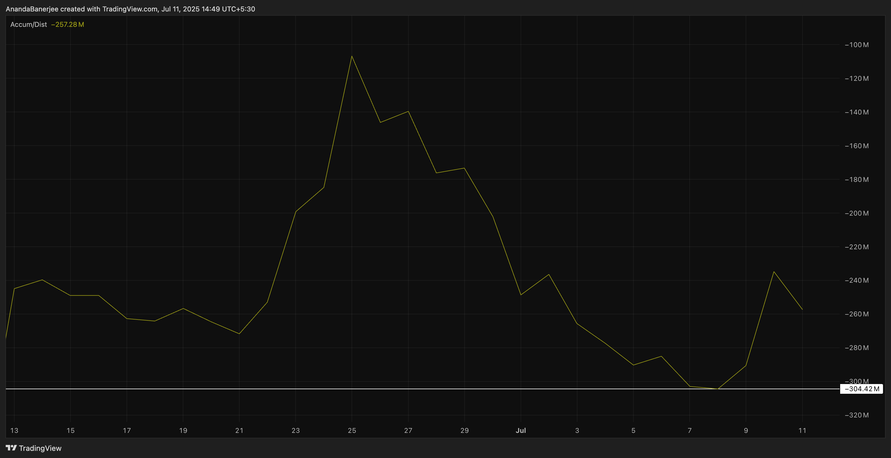 Accumulation/Distribution-linjen, der sporer forholdet mellem kurs og volumen for at opdage køb- eller salgspres, er begyndt at stige igen. Dette skete præcis den 9. juli.