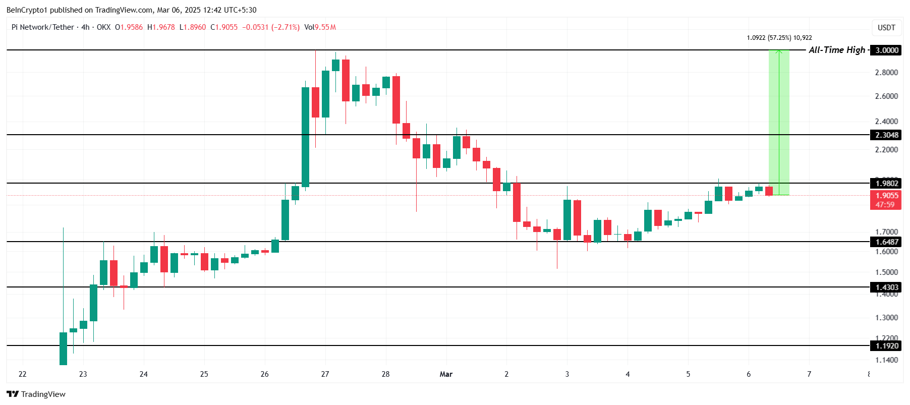 At bryde og vende $2,30 til støtte er afgørende for, at Pi Network kan fortsætte sin opadgående bevægelse. Et vedvarende skub gennem dette niveau ville sætte altcoinen på sporet til at genteste sin all-time high på $3,00, hvilket kræver en stigning på 57%. En sådan bevægelse ville bekræfte den opadgående trend og tilbyde yderligere bullish momentum for tokenet.