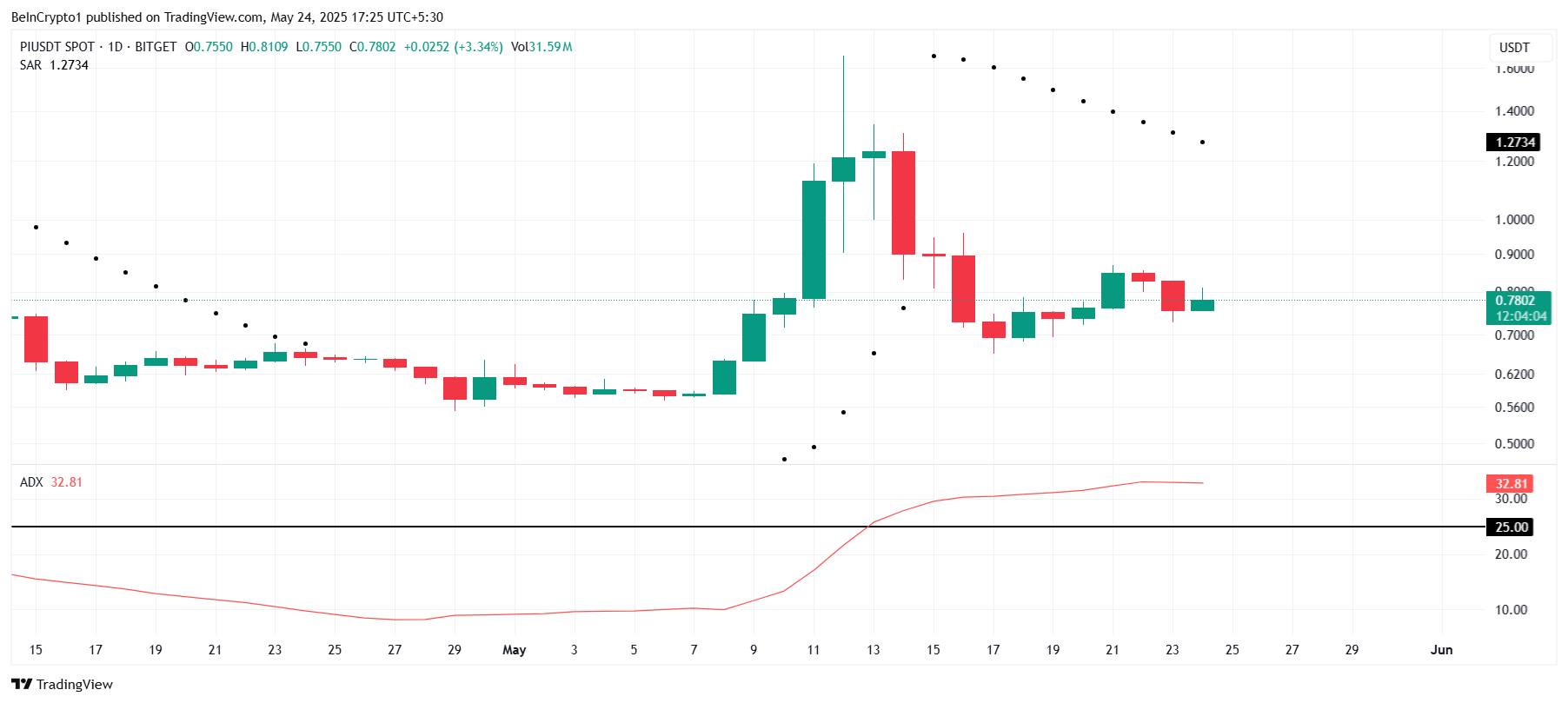 Den gennemsnitlige retningsindeks (ADX) ligger i øjeblikket på 32, hvilket er markant over 25-grænsen. Denne måling indikerer, at den nuværende trend er ved at blive stærkere. I dette tilfælde er Pi Networks trend nedadgående, hvilket forstærker den bearish stemning blandt handlende og investorer.