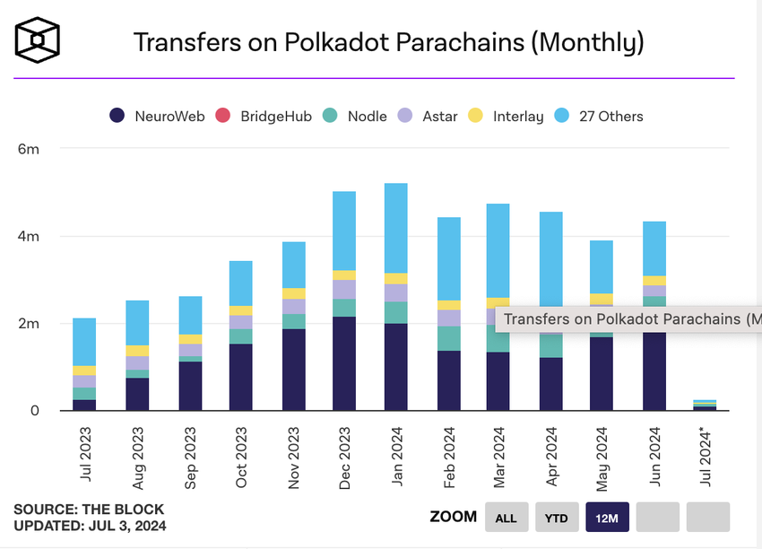 I løbet af 30-dages perioden udgjorde månedlige overførsler på tværs af parachains 4.3 millioner, en stigning på 10% fra de 3.9 millioner overførsler, der blev registreret i maj.