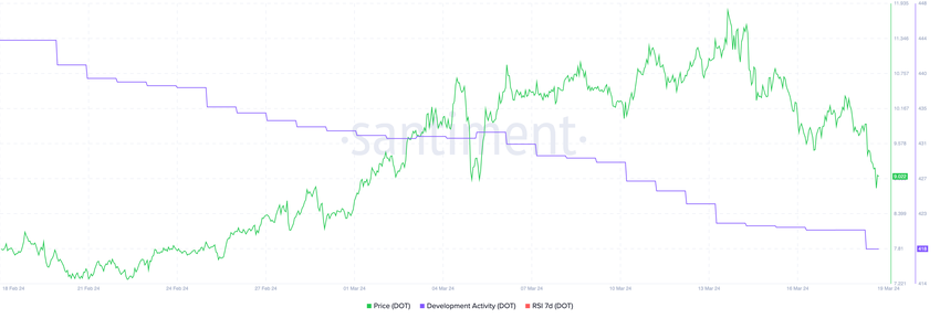 Derefter, mellem den 11. og 19. februar, oplevede vi endnu en gang dette fænomen. DOT-prisen steg fra 7,01 $ til 8,03 $. På samme tid faldt udviklingsaktiviteten med 12%. Denne adskillelse mellem disse to målinger indikerer, at DOT-prisen havde al denne vækst i 2024 – fra 8,60 $ den 1. januar til 11,6 $ den 13. marts – på grund af eksterne faktorer. Disse faktorer kunne ikke være direkte relateret til dens fundamentale forhold, som f.eks. den generelle kryptokur.