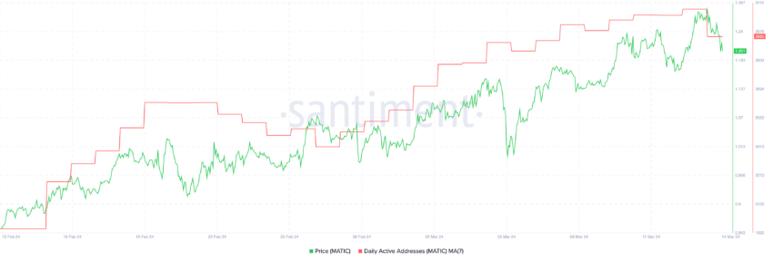 Fra den 13. februar til den 7. marts oplevede antallet af daglige aktive adresser, der var i kontakt med MATIC, et betydeligt spring, der eskalerede fra 2.468 til 3.275. Dette skift indikerer en bemærkelsesværdig vækstrate på 32,70% inden for blot tre uger.