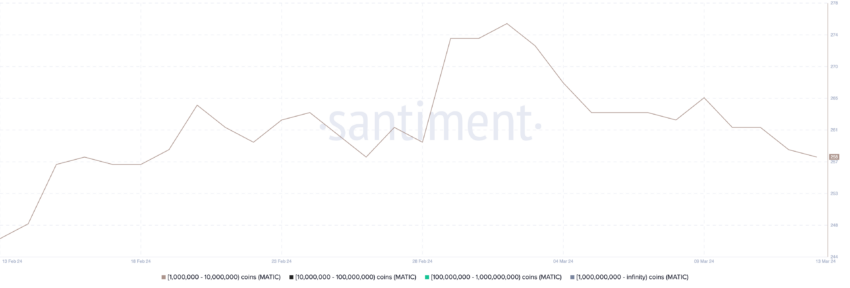 Antallet af adresser, der ejer mindst 1.000.000 MATIC, er også faldende. Den 2. marts nåede det sit højeste niveau nogensinde med 276 MATIC-hvaler. Men siden den dag er antallet af hvaler faldet til 258 den 14. marts.