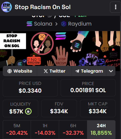 Interessant nok har nogle blockchain-brugere som svar på disse negative memecoins lanceret positive alternativer og understreget den gunstige udvikling inden for sektoren. Især en memecoin ved navn Stop Racism on Solana er steget med omkring 19.000% i løbet af de sidste 24 timer.