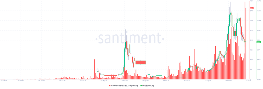 Ifølge on-chain-data fra Santiment nåede aktive adresser på Render-netværket en rekordhøjde den 17. juli. Aktive adresser måler det anslåede antal brugere, der direkte deltager i transaktioner på en blockchain.