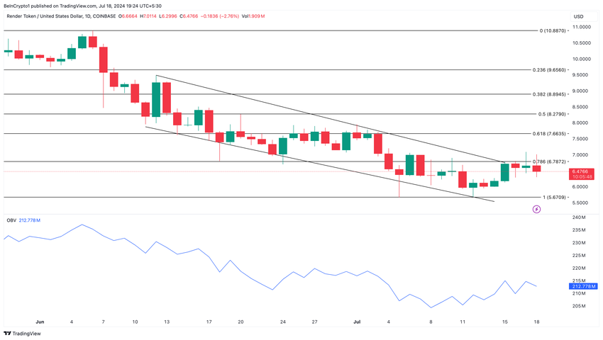 I øjeblikket viser OBV en nedadgående tendens, hvilket indikerer, at markedsdeltagernes hensigt er at sælge. Hvis dette fortsætter, kan RNDR forblive fastlåst inden for intervallet $6,16 til $6,47.