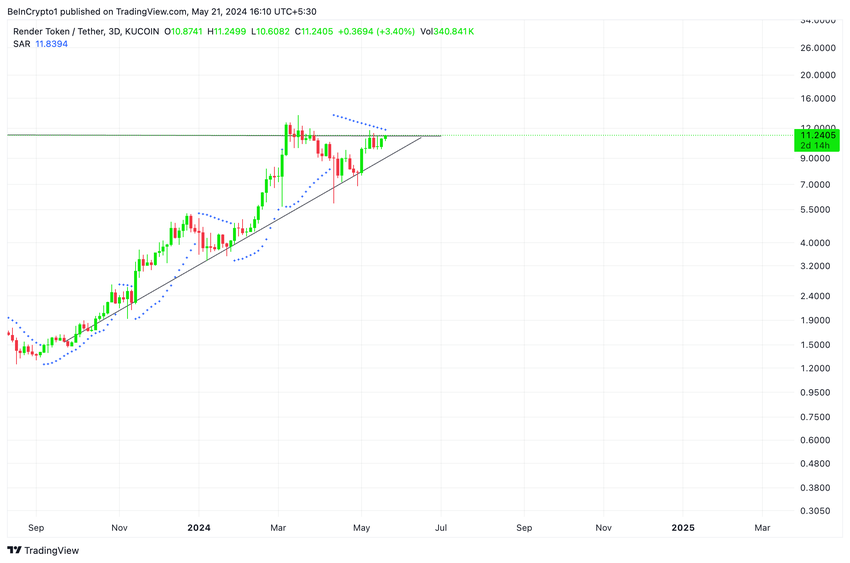 Render (RNDR) er klar til at bryde over den øverste linje i en stigende trekant i forlængelse af sin seneste opadgående tendens.