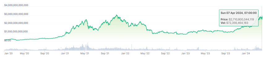 Siden halveringen i 2020, er den samlede kryptomarkedsværdi desuden vokset med over 1.040%, til 2,72 billioner dollars den 8. april 2024, ifølge data fra CoinGecko.