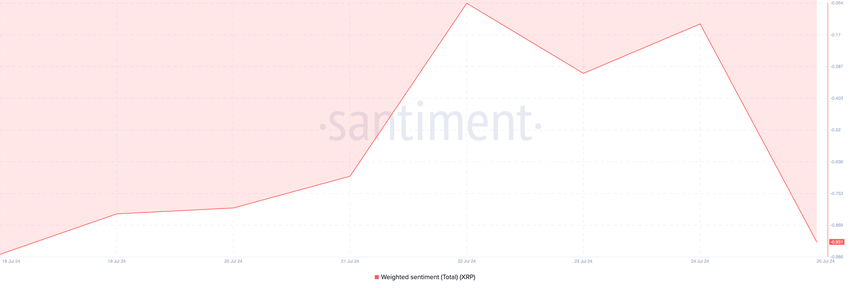 I øjeblikket er XRP’s vægtede stemning negativ på -0.93. Denne måling sporer den generelle stemning på markedet i forhold til et aktiv. Når dens værdi er under nul, tyder det på, at de fleste sociale mediediskussioner om aktivet er drevet af negative følelser som frygt, usikkerhed og tvivl. Det anses ofte som en forløber for et kursfald.