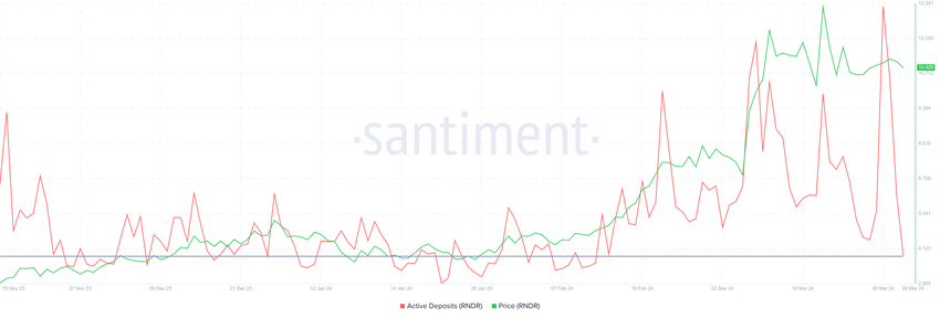 Men det er ikke kun akkumuleringen, der er en positiv udvikling; overbevisningen blandt investorerne er også stigende. Det fremgår af faldet i aktive indskud, som viser, at RNDR-indehaverne har til hensigt at sælge.