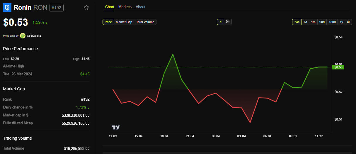 Denne proces sikrer kontinuitet og reducerer friktion, især for RON-indehavere, Ronin-netværkets native aktiv. I øjeblikket handlede RON til $0,53, oppe næsten 2% i de sidste 24 timer.