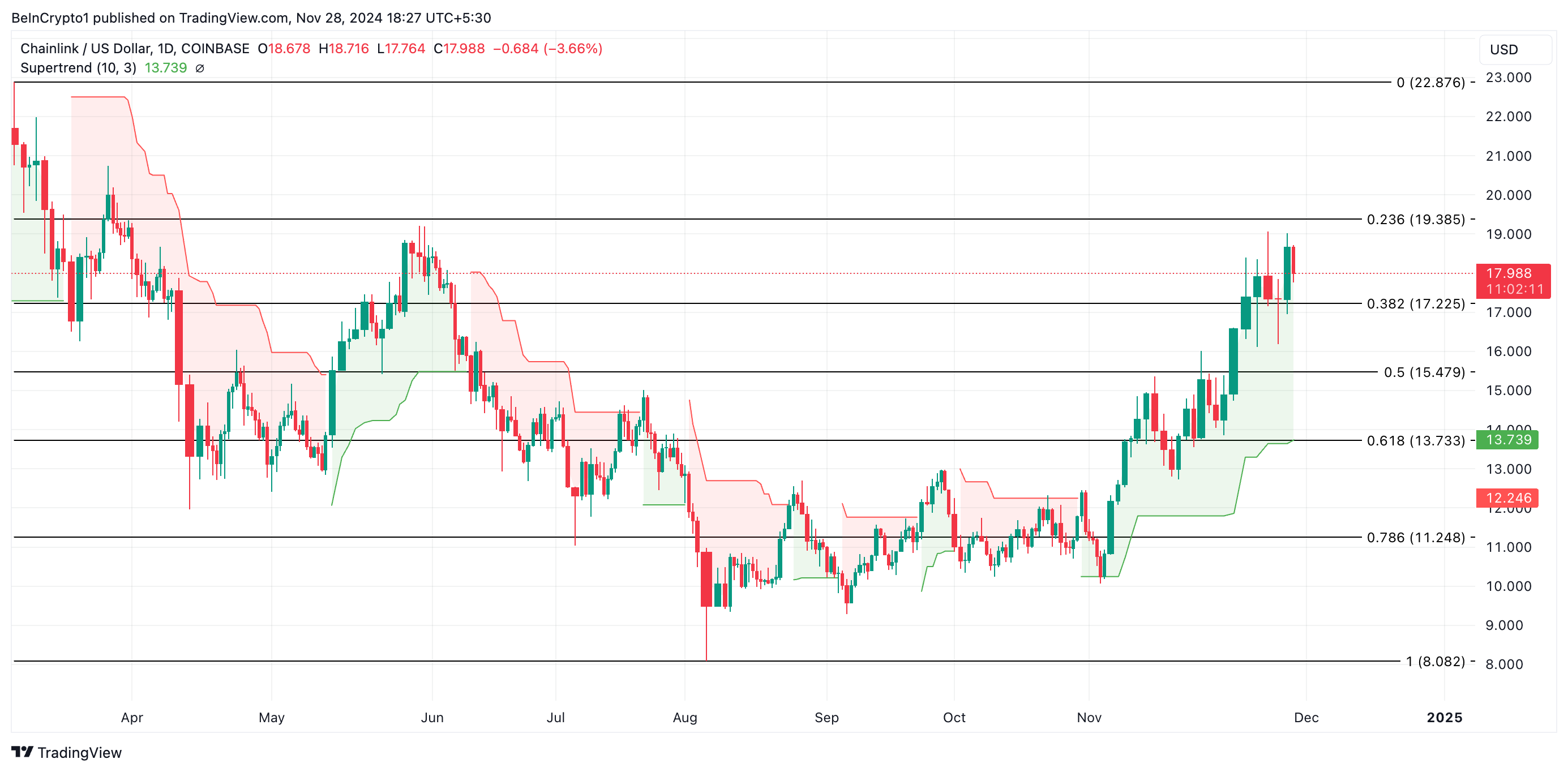 Det vises som en linje på kursdiagrammet, der skifter farve for at afspejle trendretningen: rød for en nedtrend og grøn for en optrend. Som i LINK’s tilfælde, når Super Trend linjen vises under aktivets kurs, indikerer det en optrend, hvilket antyder, at bullish momentum sandsynligvis vil fortsætte.
