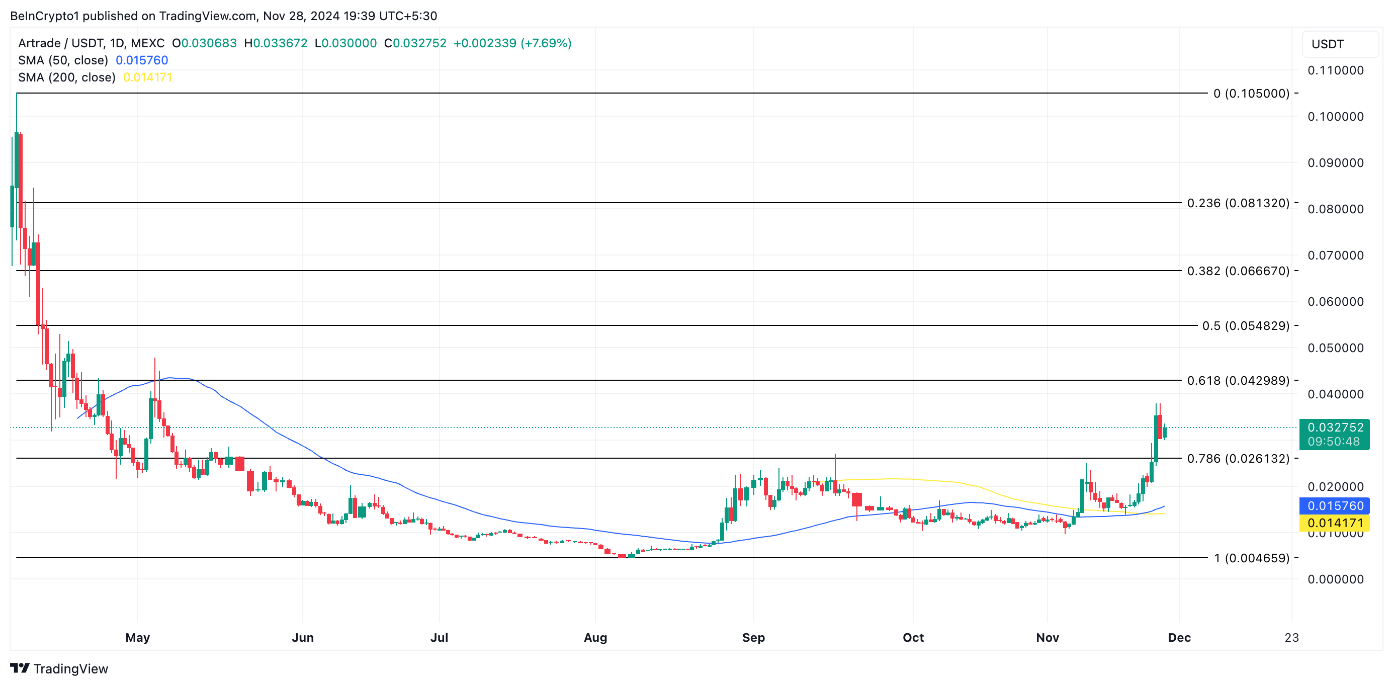 På dets daglige diagram krydsede ATR’s 50-dages Simple Moving Average (SMA) over dets 200-dages SMA den 23. november, hvilket udløste det, der er kendt som en “gylden krydsning”—et stærkt bullish signal, der antyder opadgående kursmomentum. Efter krydsningen er ATR’s kurs steget med 38%, og har nået et seksmåneders højdepunkt på $0.032 i skrivende stund.