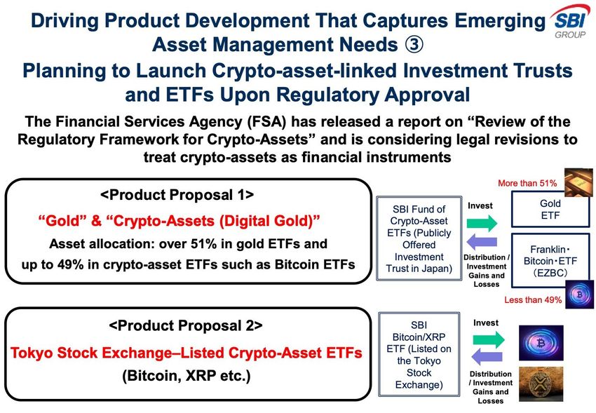 SBI har i sin Q2-resultatmeddelelse offentliggjort indsendelsen af to nye børshandlede fonde (ETF’er), der inkorporerer XRP, Bitcoin og guld. Initiativet er en del af deres finansielle strategi for Q2 2025. Meddelelsen blev først afsløret via sociale medier af XRP-fællesskabsfiguren Amelie.