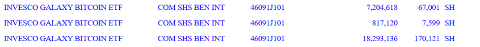 I mellemtiden strækker Wells Fargos Bitcoin-eksponering sig ud over BlackRocks flagskibsprodukt, IBIT. Banken øgede også sin andel i Invesco Galaxy Bitcoin ETF (BTCO) fra 2,5 millioner dollars til cirka 26 millioner dollars i samme kvartal.