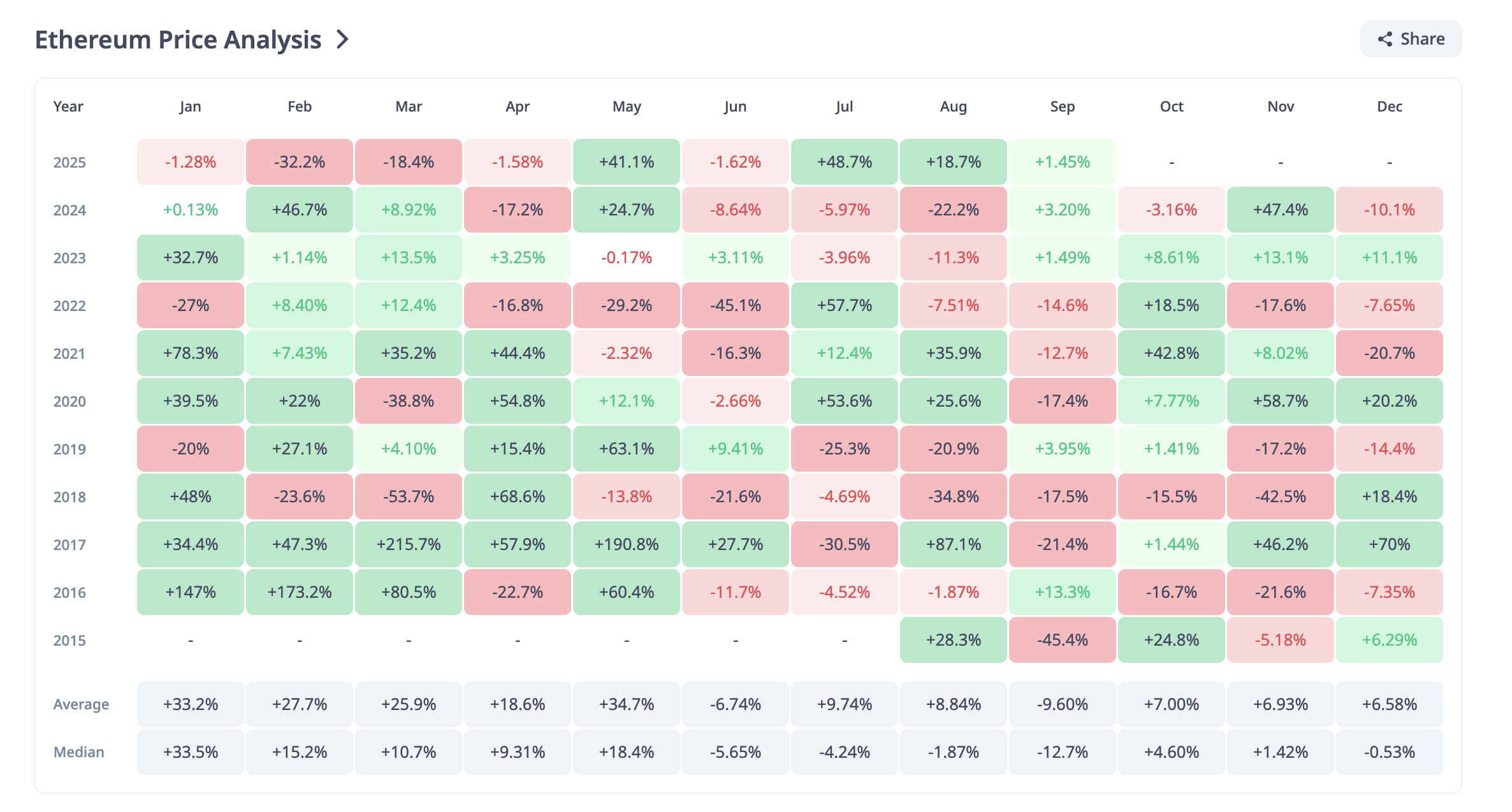 I mere end et årti har september været den værste måned for krypto. Bitcoin har haft en median septemberafkast på –3,1% siden 2013, mens Ethereums er endnu svagere med –12,7%. Historiske kollaps — som Bitcoins –19% fald i 2014 eller Ethereums –21% fald i 2017 — gav anledning til udtrykket “crypto September blues.”